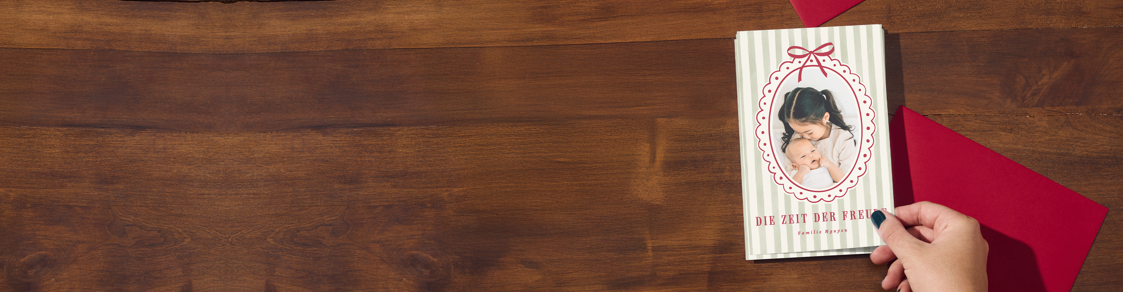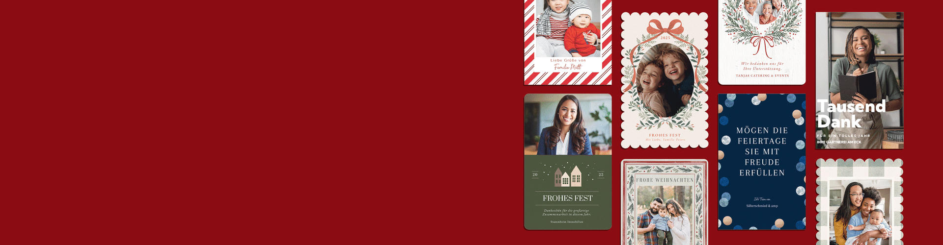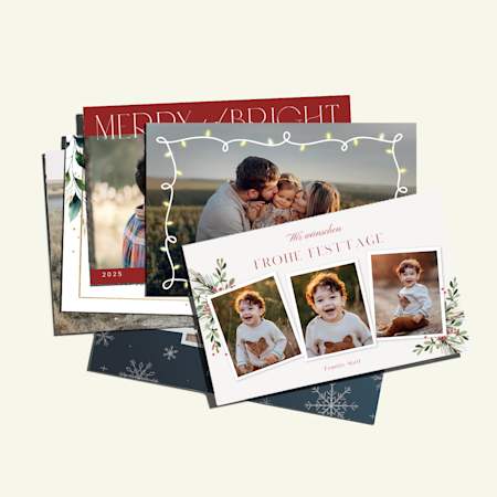 Fangen Sie doch einfach bei unseren Designvorlagen für Festtagskarten 2025 an, um Ihr Lieblingsdesign zu entdecken. Mit Designs zu einer Vielzahl winterlicher Anlässe, darunter neben Chanukka auch Neujahr, haben Sie die Qual der Wahl. Bei uns finden Sie verschiedene Styles für unterschiedliche Themen und Anlässe, wie beispielsweise Haustier-Weihnachtskarten, Geburtsankündigungen zum Fest und Weihnachtskarten für frisch Vermählte (herzlichen Glückwunsch von uns!). Aber auch für feierliche Firmenpost werden Sie bei uns fündig. Klicken Sie sich einfach durch unsere geschäftlichen Weihnachtskarten, mit denen Sie Ihrer Kundschaft zum Fest eine Freude machen können.