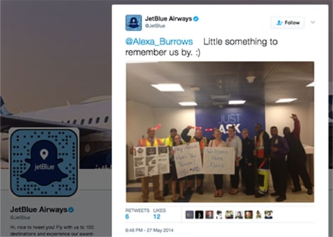 Richtig guter Kundenservice hat sogar das Potenzial zum viralen Internet-Hit. Ein gutes Beispiel dafür ist JetBlue. Das Twitter-Profil der Fluggesellschaft ist bekannt für eine hervorragende Rückmeldequote und trägt damit signifikant zu einer positiven Kundenerfahrung bei. Unten abgebildet ist die Antwort von JetBlue auf einen Kunden-Tweet, die in den sozialen Medien massenhaft geteilt wurde. Eine Passagierin, die eine Anfrage an das Unternehmen gepostet hatte, wurde bei ihrer Ankunft von einem Empfangskomitee der Fluggesellschaft begrüßt. Über den Tweet-Austausch wurde ausführlich in den Medien berichtet, was zu einer noch positiveren öffentlichen Wahrnehmung des Kundenservices von JetBlue führte.