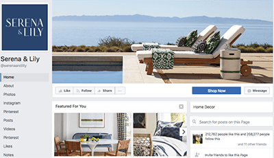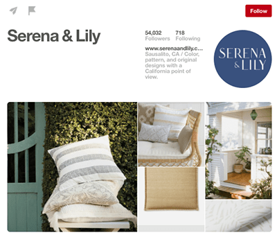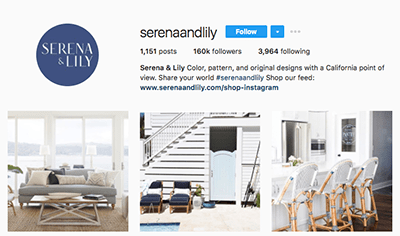 Serena & Lily, ein Online-Versandhandel für Inneneinrichtung, ist ein hervorragendes Beispiel dafür, wie es gelingen kann, eine Marke über alle sozialen Medien hinweg konsistent zu präsentieren. Auch wenn jedes Profil (Instagram, Facebook und Pinterest) etwas anders aussieht, verbindet sie alle eine erkennbare Markenidentität, die dabei hilft, die Marke zu etablieren.