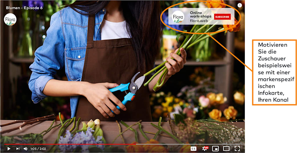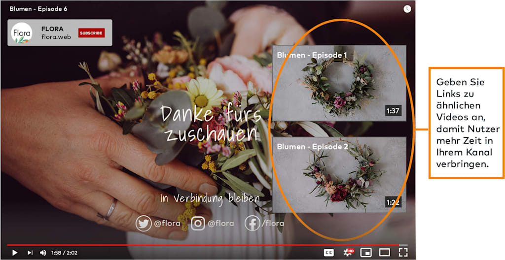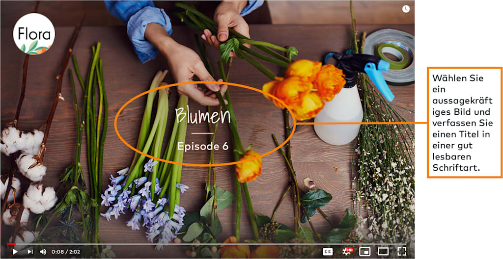 Wenn Sie beispielsweise eine Tutorial-Reihe rund um Blumen planen, können Sie die Videos in Folgen gliedern: Blumenarrangements mit Flora, Folge 6 (Sie dürfen nicht vergessen, im Abspann die restlichen Videos aus der Reihe zu verlinken.)
