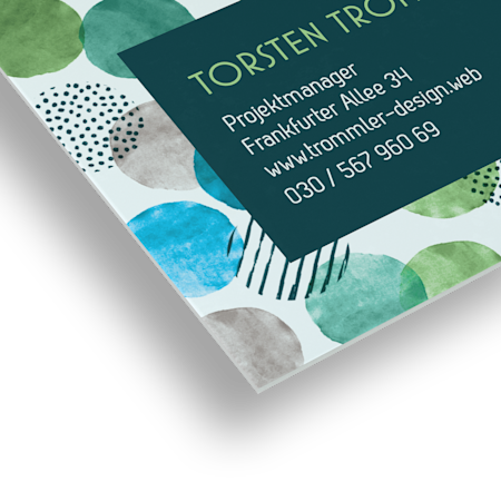 Bei diesem Druckverfahren werden ausgewählte Texte und Bilder mittels Relieflack hervorgehoben, sodass ein plastischer 3D-Effekt auf dem Papier entsteht. Bei unseren Visitenkarten mit UV-Spotlack können Sie entscheiden, welche Elemente Sie hervorheben möchten.