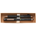 Hinterlassen Sie einen bleibenden Eindruck mit diesem raffinierten Geschenkset, das Stil und Funktionalität vereint. Dieses Duo bietet stilvolle Präsentation und zuverlässige Leistung. Das Set umfasst einen einziehbaren Kugelschreiber und einen Kappen-Gelstift, beide aus Recycling-Kunststoff mit einer markanten steintexturierten Oberfläche und warmen bronzenen Akzenten. Ideal als Firmengeschenk oder für Executive Branding. Der Artikel ist ganz einfach zu personalisieren – nutzen Sie unser intuitives Studio, um Ihr Logo, Ihre Botschaft oder Ihre Firmeninfos hinzuzufügen. Benötigen Sie Unterstützung? Unsere Designprofis helfen Ihnen gern dabei, Ihre Ideen umzusetzen.