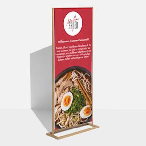 Bereit, Ihre Displaybanner aus Holz zu gestalten? Schauen Sie sich die individuell anpassbaren, branchenspezifischen Vorlagen in unserer Galerie an oder laden Sie Ihr eigenes Design hoch. Wenn Sie Ihrem Design den letzten Schliff verpasst haben, können Sie Ihre Bestellung abschließen. Wir kümmern uns um den professionellen Druck Ihres Banners und versenden es mit dem Holzrahmen direkt an Sie. Sie benötigen Hilfe? Von Design bis Versand stehen Ihnen unsere Experten gerne telefonisch, per E-Mail oder im Chat zur Verfügung.